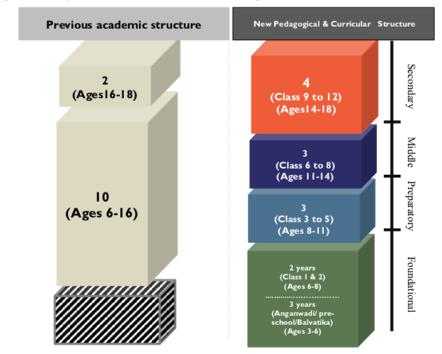 The National Education Policy 2020 (NEP) has laid importance on the universalisation of Early Childhood Care and Education (ECCE) with a 2030 target to ensure that all students entering Grade 1 are school ready. The pedagogical and curricular structure of school education has been changed to reflect the importance. In the ages of 3 to 6 years, pre-schools will provide basic education to children, to prepare them for formal education from Grade 1 onwards.